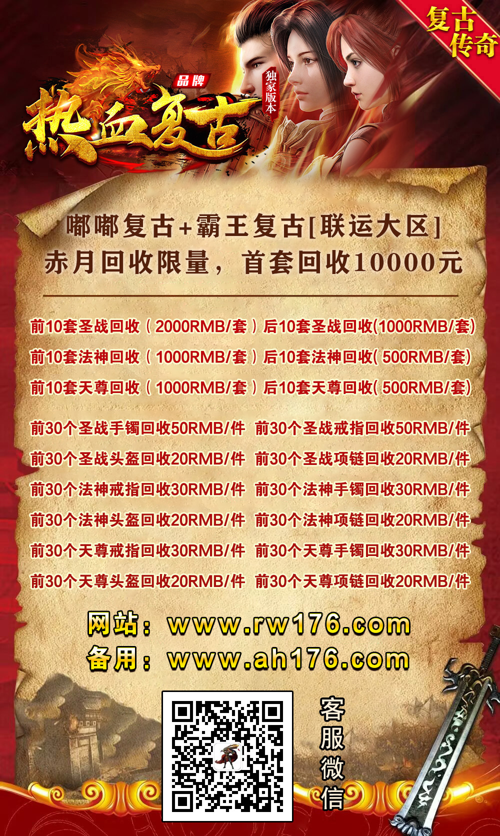 【职业平衡】:精心把三职业的均衡做到了极致,法师打宝,道士辅助,战士双烈火PK越货。